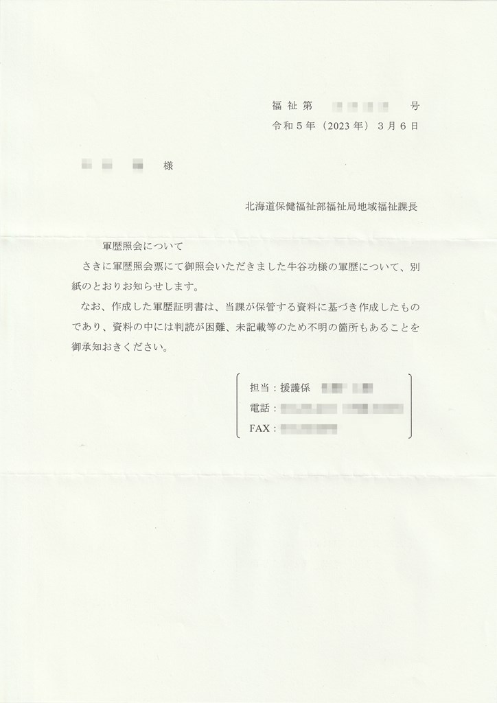 北海道へ陸軍の軍歴証明書を請求し、到着するまで、およそ2~3週間かかりました。