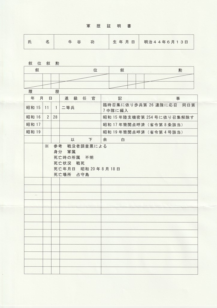 牛谷功は、「軍属」とだけ聞いていましたが、どうやら陸軍では「二等兵」だそうです。