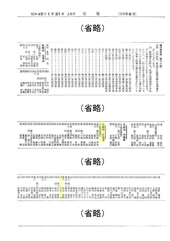 『官報』(昭和45年1月31日)戦没者叙勲(一部改変)