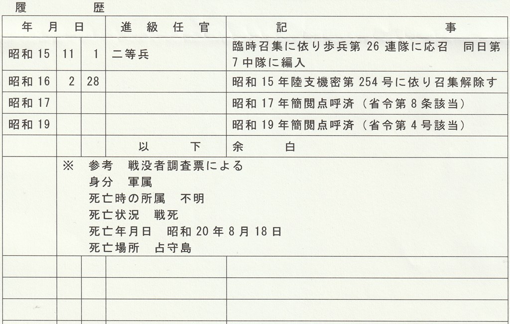 占守島の戦いの時は、海軍の軍属だったので陸軍の軍歴証明書の内容は薄いかなと予想していましたが、かなり簡素なものでした。